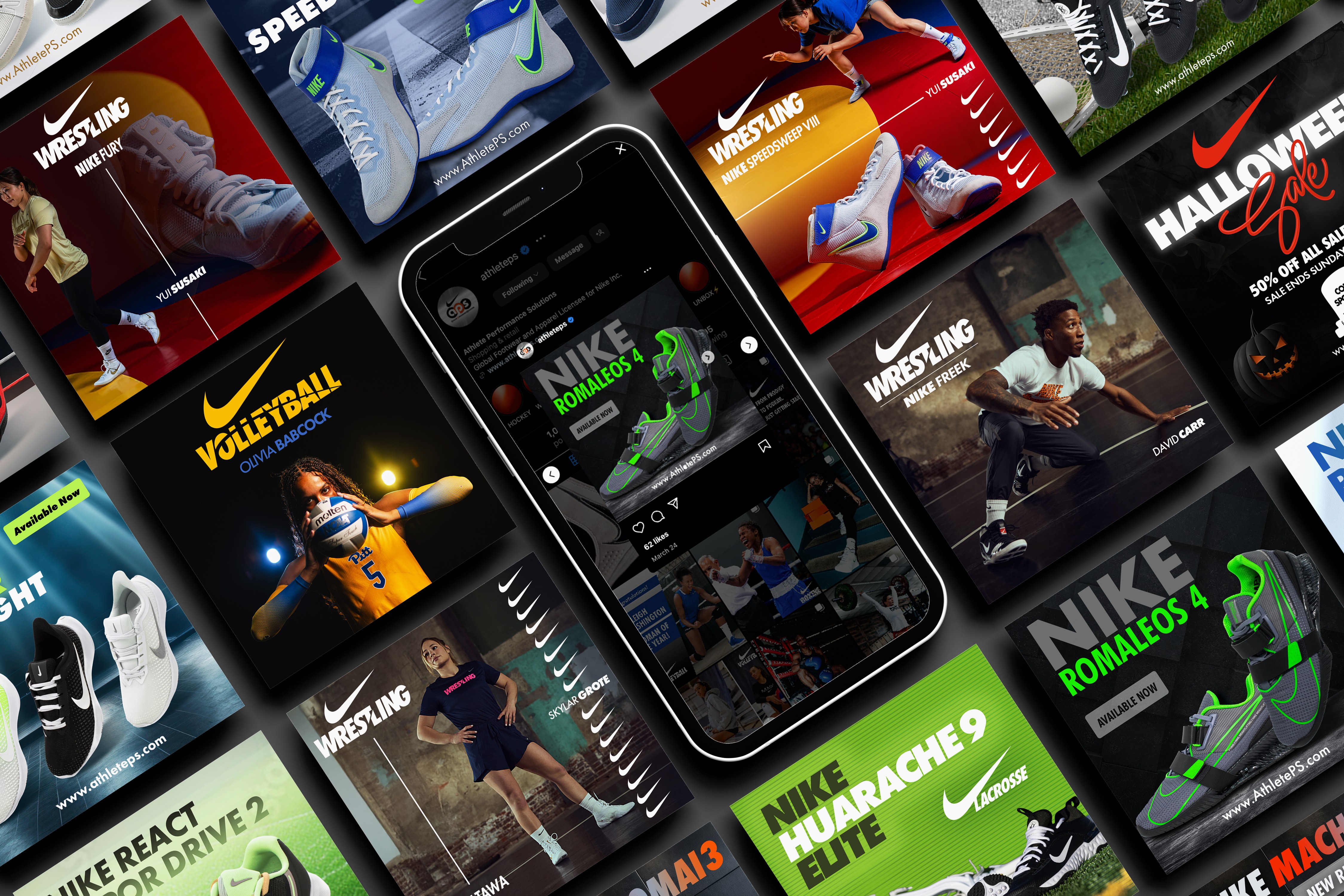 I developed a wide range of social media graphics for APS across wrestling, volleyball, boxing, cheer, and weightlifting. Each campaign was designed to elevate key product stories—whether highlighting new Nike footwear, showcasing athlete partnerships, or promoting seasonal drops and sales. I created dynamic layouts, color treatments, and sport-specific visual systems that worked cohesively across Instagram, Facebook, and web placements. My work included building complete asset suites for multi-post campaigns, athlete features, product highlights, and promotional graphics, ensuring strong brand consistency and high visual impact across every digital touchpoint.