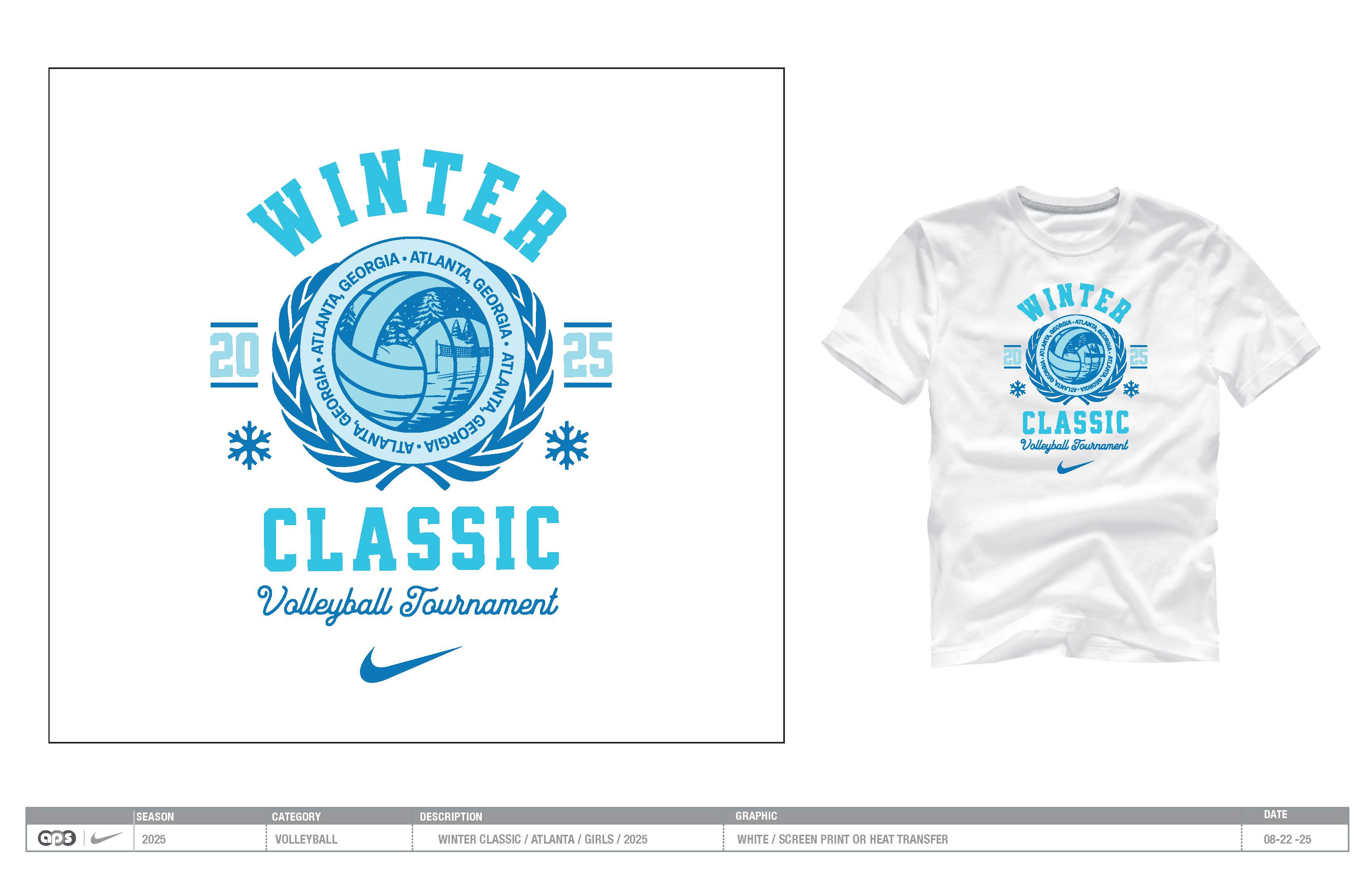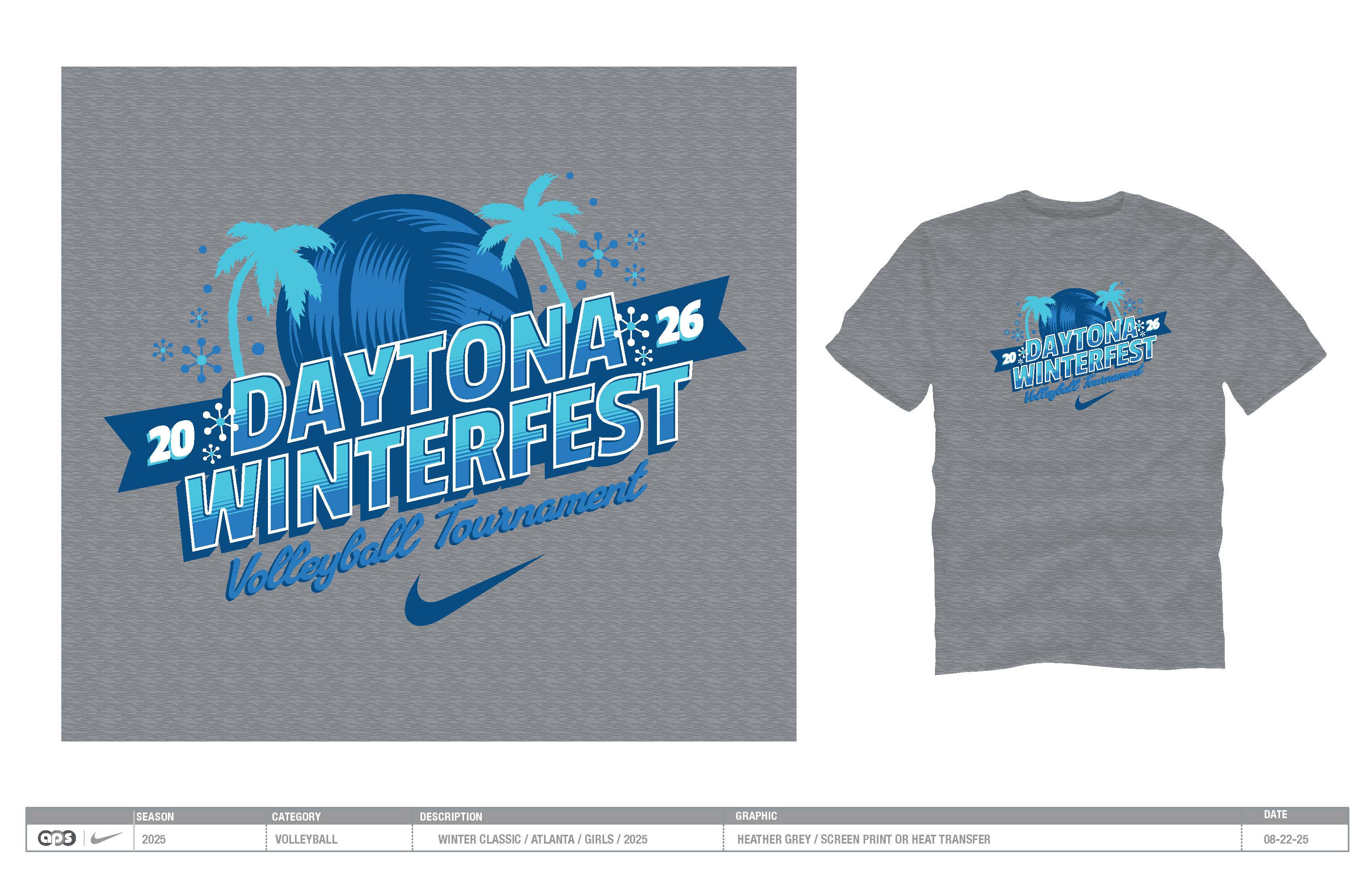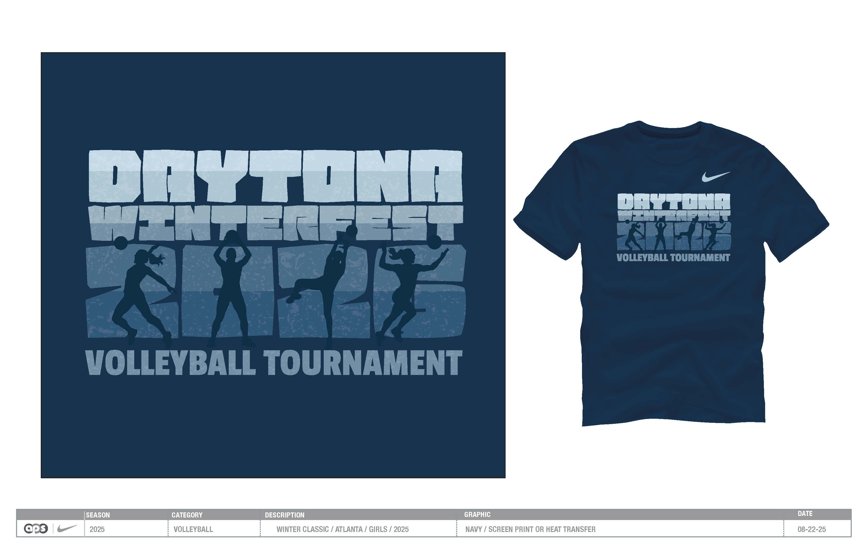 I designed event tee shirt graphics for the Atlanta Winter Classic and Daytona Winterfest volleyball tournaments. Each design explored multiple colorways , balancing bold typography with sport-specific iconography and event branding. The goal was to create energetic, versatile graphics that captured the competitive spirit of youth volleyball events.
