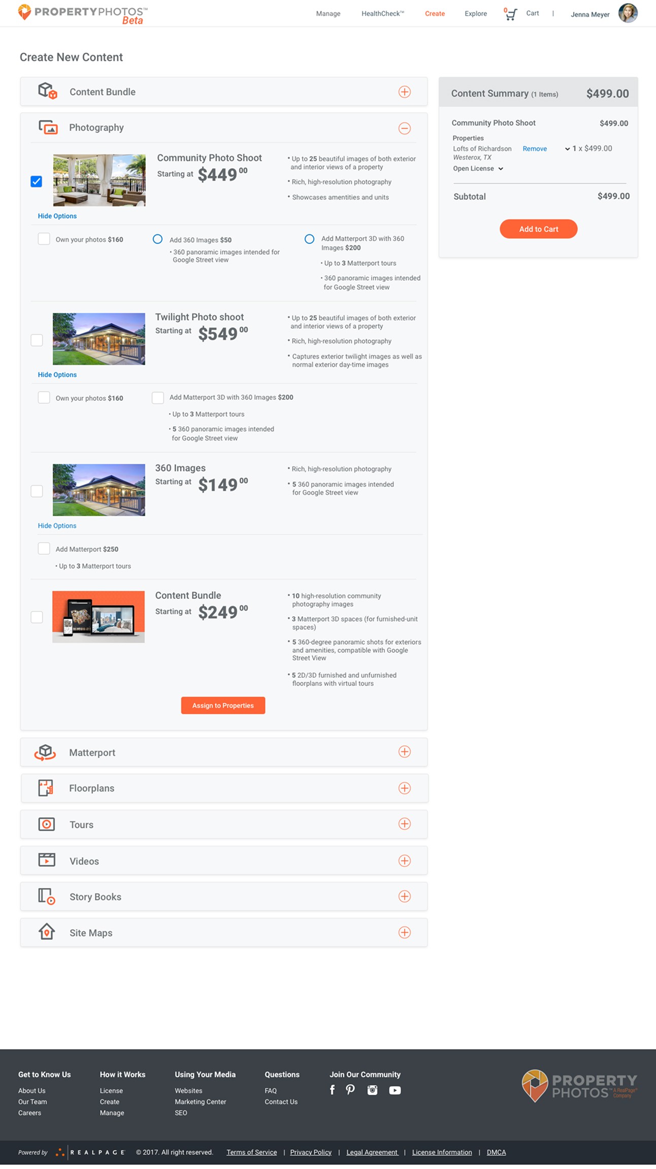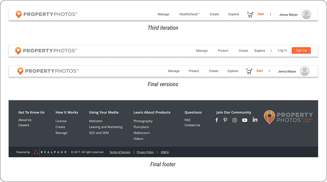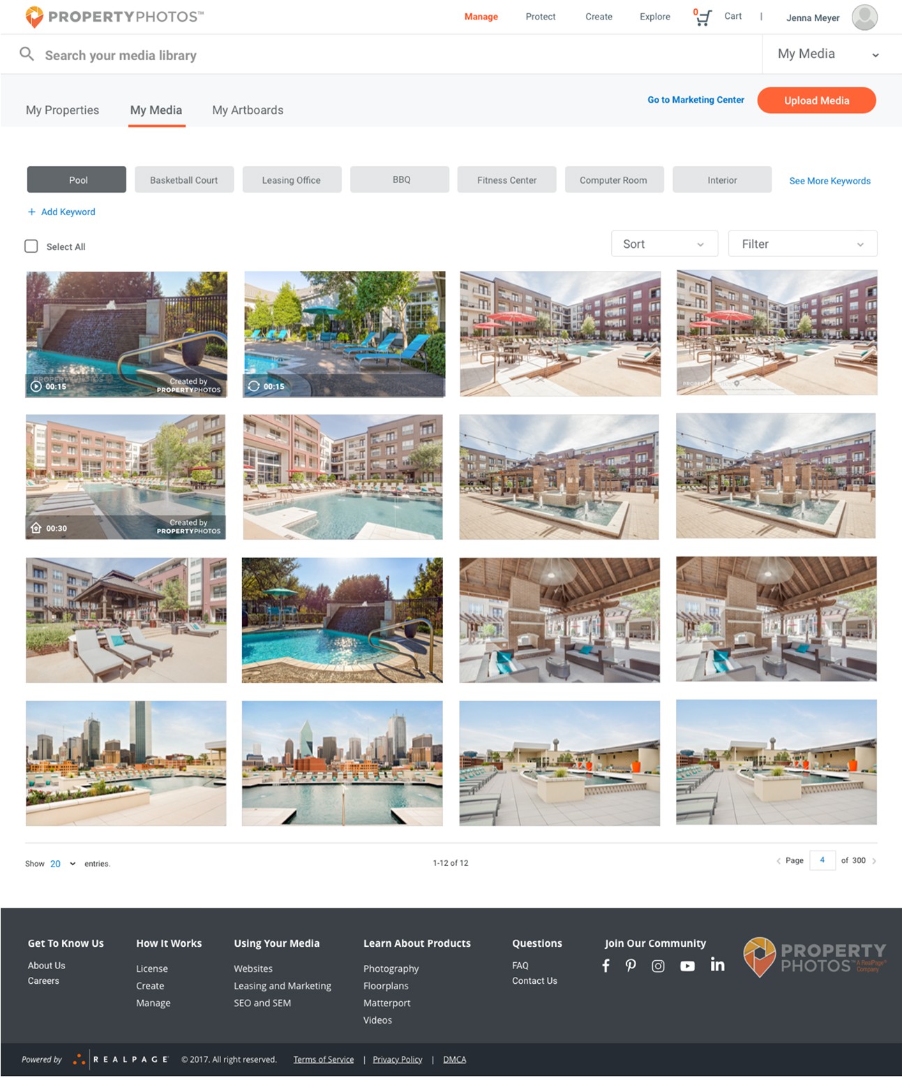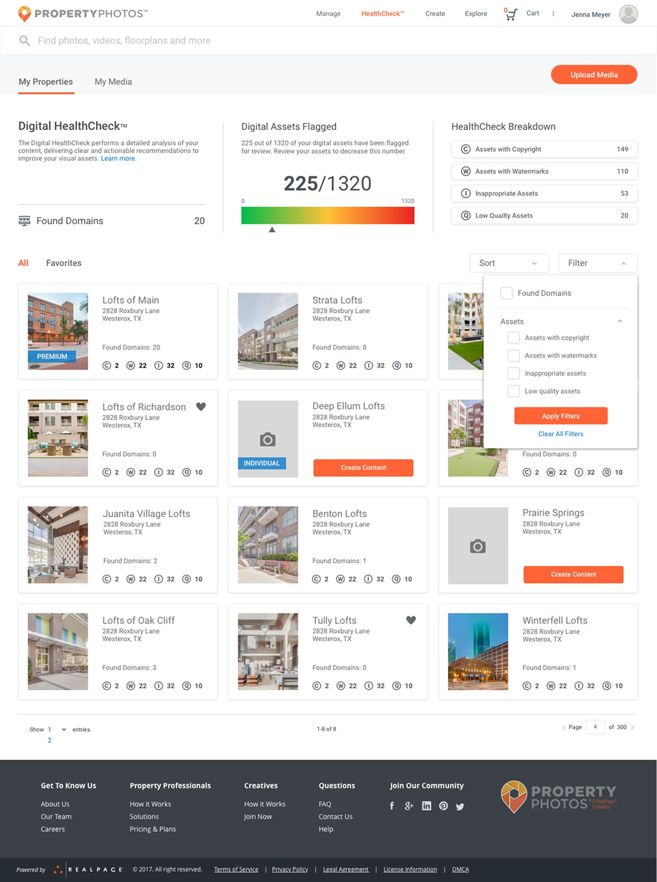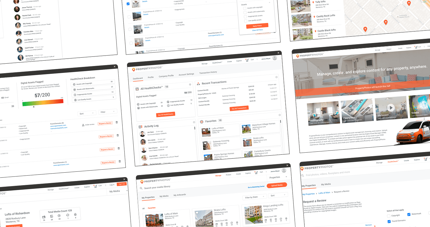 RealPage is a software company serving the multifamily, commercial, single-family, and vacation rental housing industries. PropertyPhotos was a new initiative developed to streamline how property management companies source, manage, and protect their media assets. The goal was to create a customer-facing platform where users could purchase stock and custom media, as well as manage assets at the property level using a Digital Asset Manager (DAM). This replaced a previously manual process handled through customer service and creative teams. A key feature of the platform was the integration of Digital HealthCheck™, a tool designed to help users analyze, safeguard, and proactively address potential risks related to their media assets.
