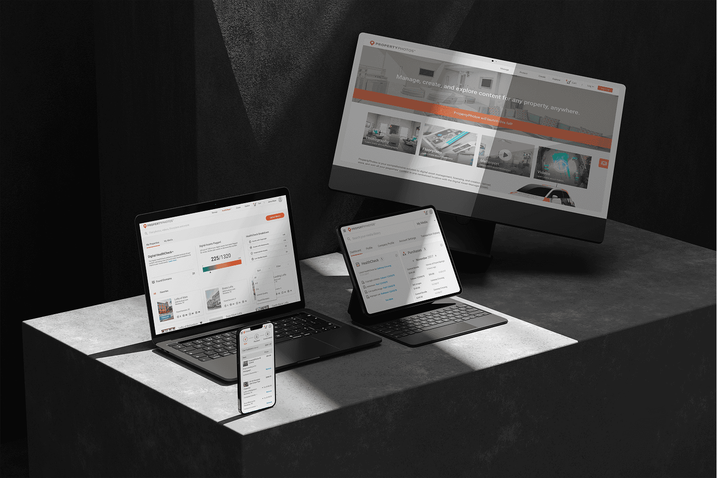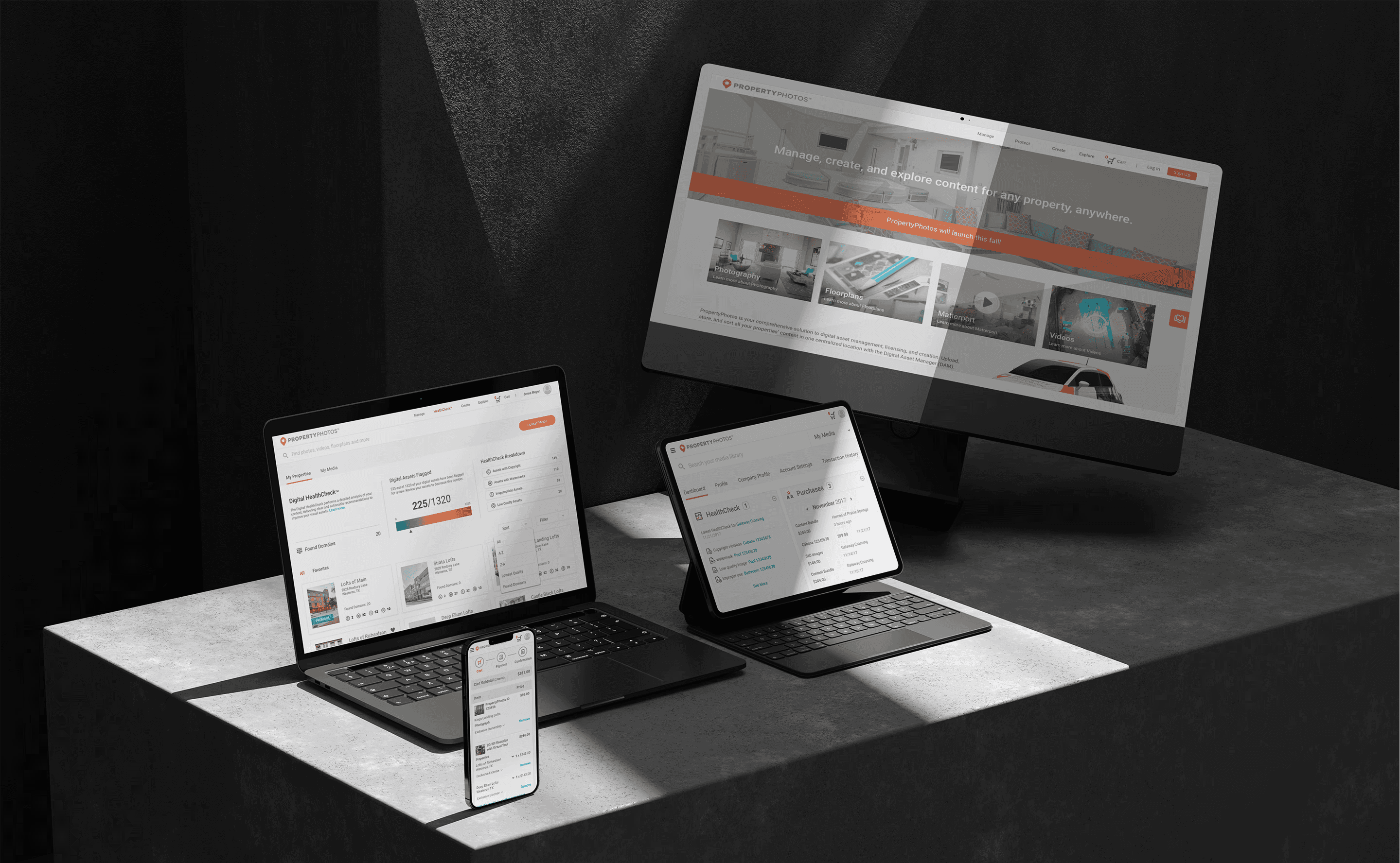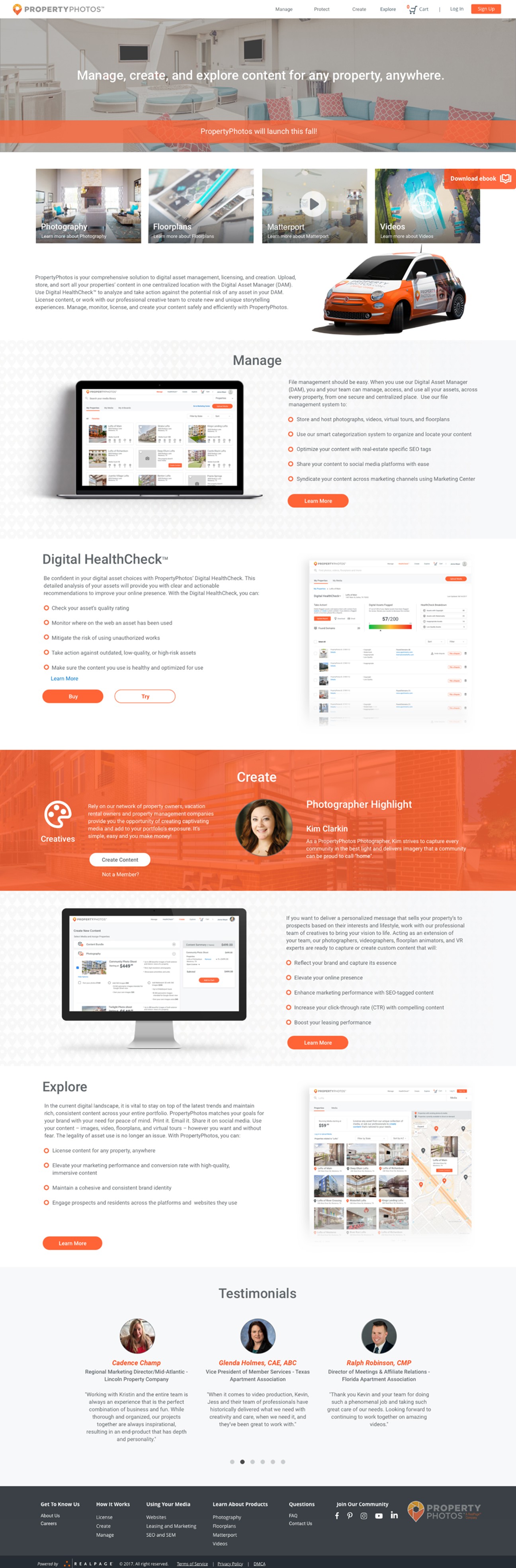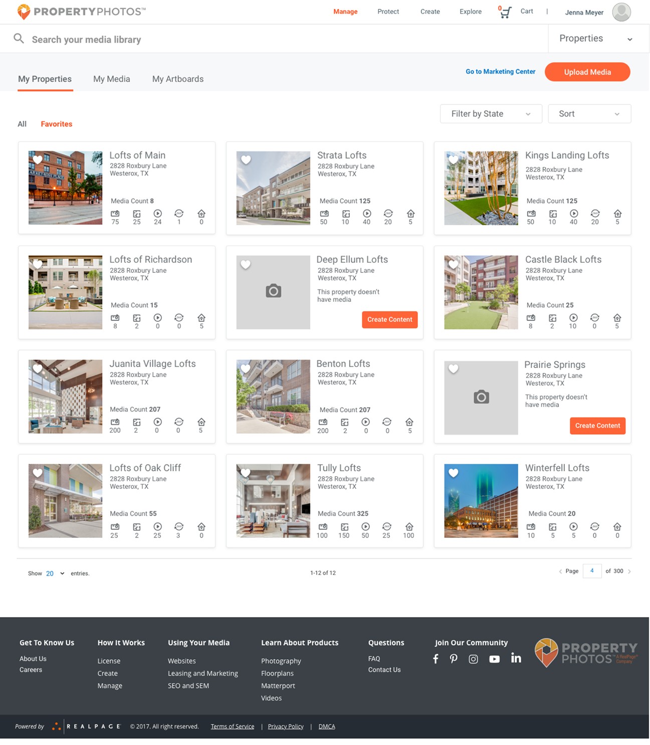 RealPage is a software company serving the multifamily, commercial, single-family, and vacation rental housing industries. PropertyPhotos was a new initiative developed to streamline how property management companies source, manage, and protect their media assets. The goal was to create a customer-facing platform where users could purchase stock and custom media, as well as manage assets at the property level using a Digital Asset Manager (DAM). This replaced a previously manual process handled through customer service and creative teams. A key feature of the platform was the integration of Digital HealthCheck™, a tool designed to help users analyze, safeguard, and proactively address potential risks related to their media assets.